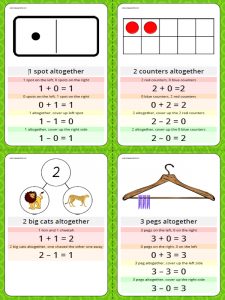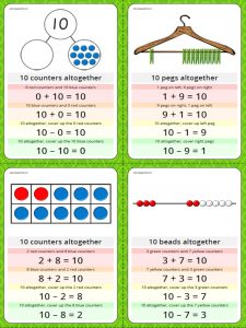Set of posters showing pictorial representations of number bonds for 10 along with the associated fact families.