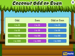 Coconut Odd or Even is a maths game which can help you to identify odd and even numbers. (www.topmarks.co.uk)